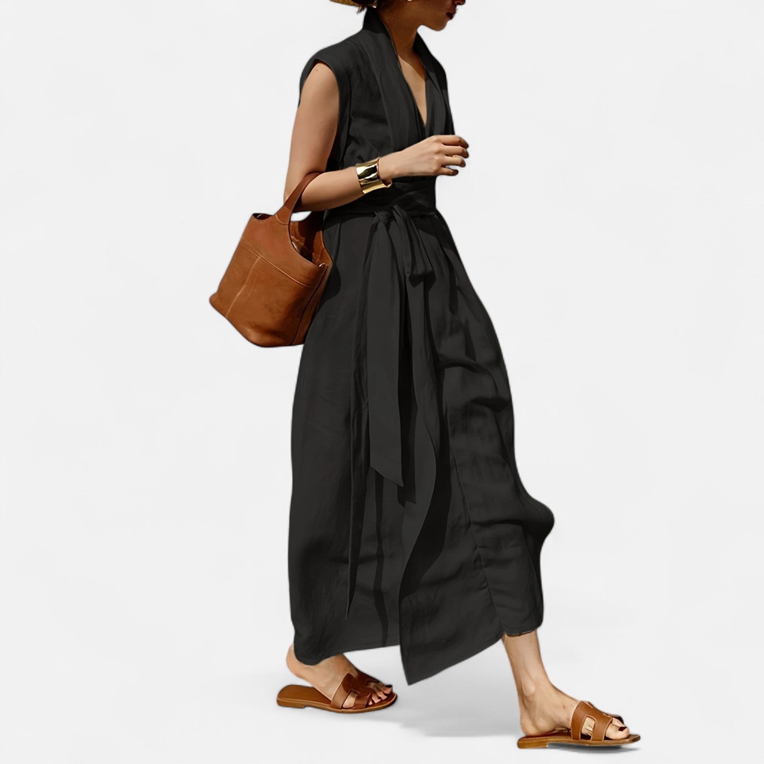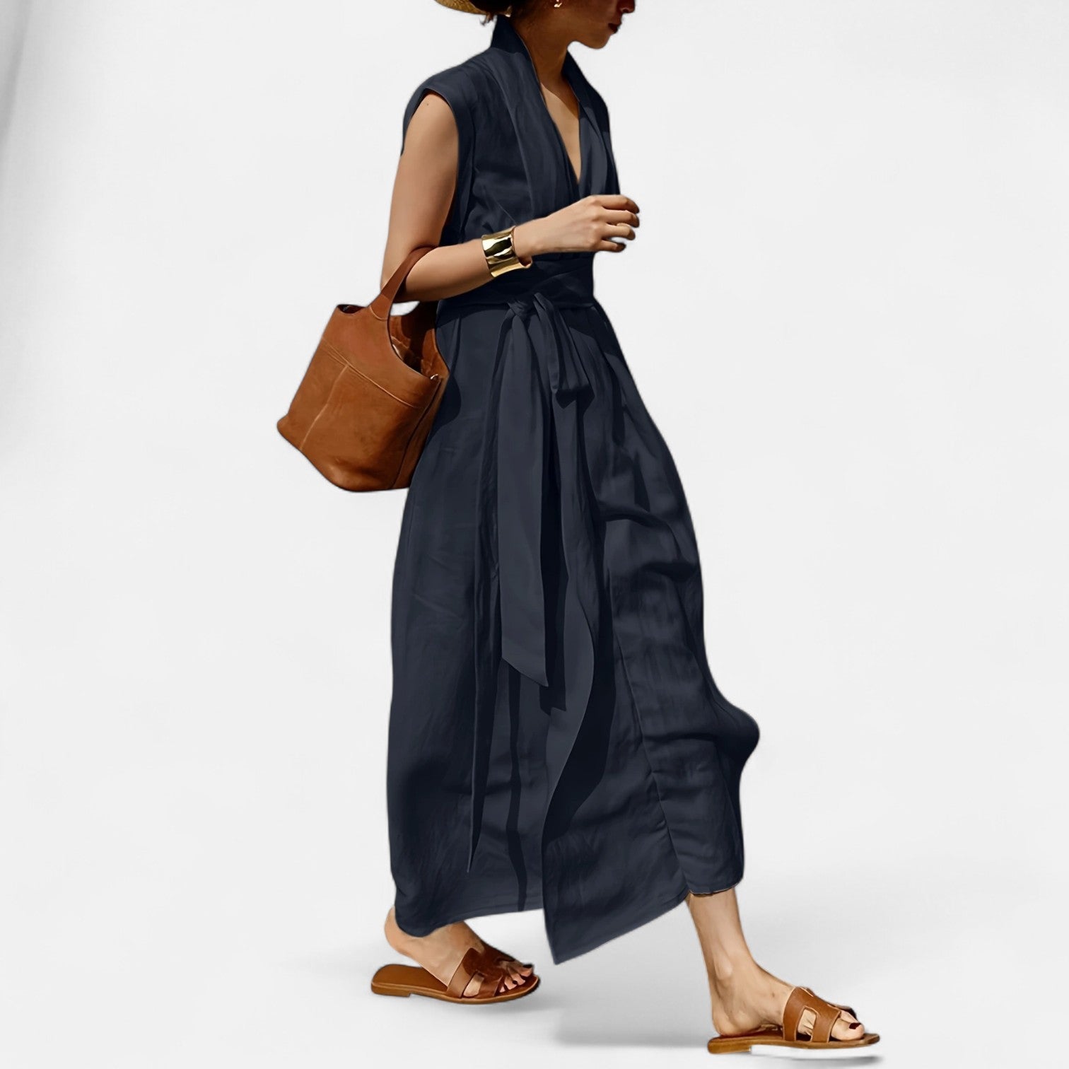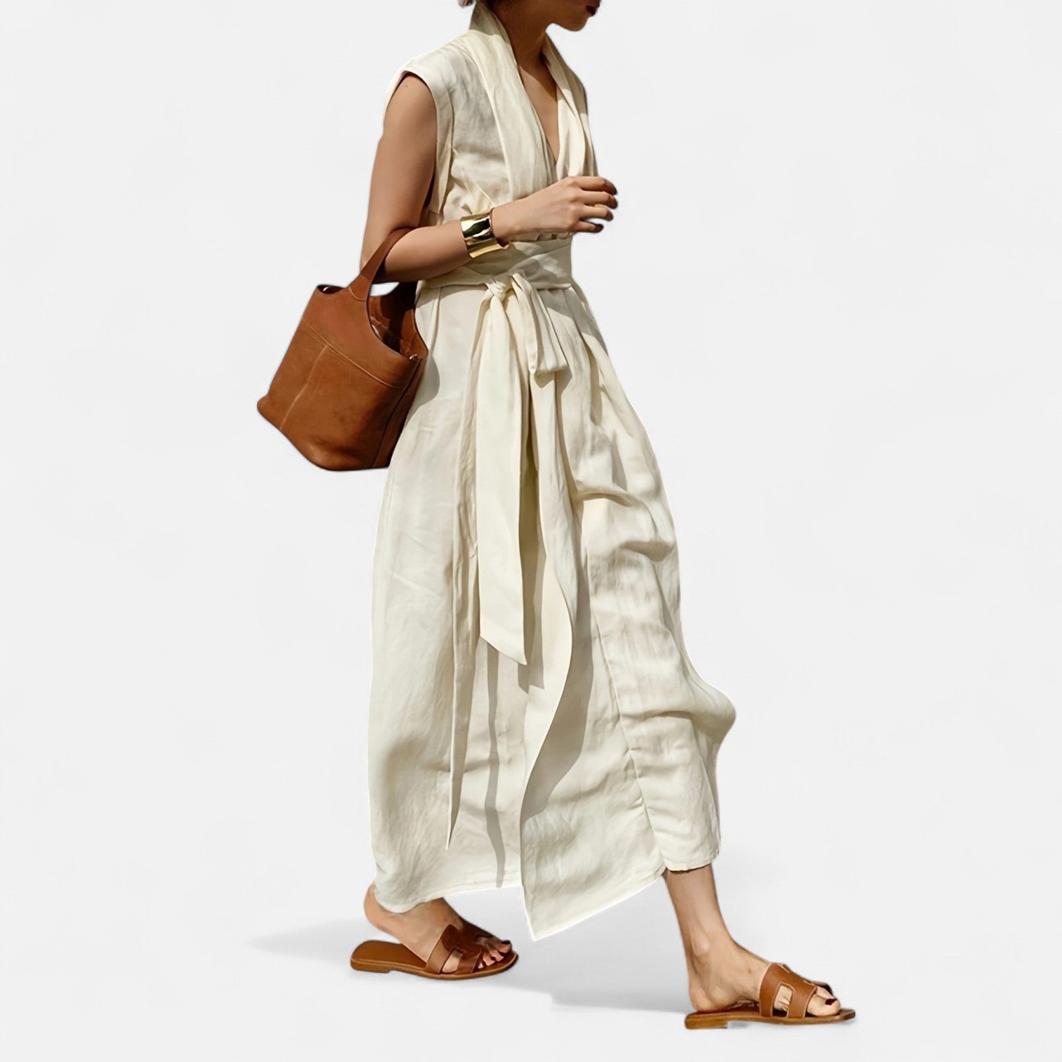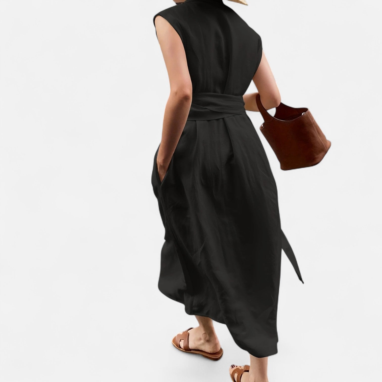 Crafted from a breathable linen blend, this dress keeps you cool while maintaining its refined drape. The sleeveless cut encourages freedom of movement, while the detachable belt allows you to define your waist for a polished silhouette. Hidden side pockets add discreet practicality, ensuring comfort meets elegance in every detail.