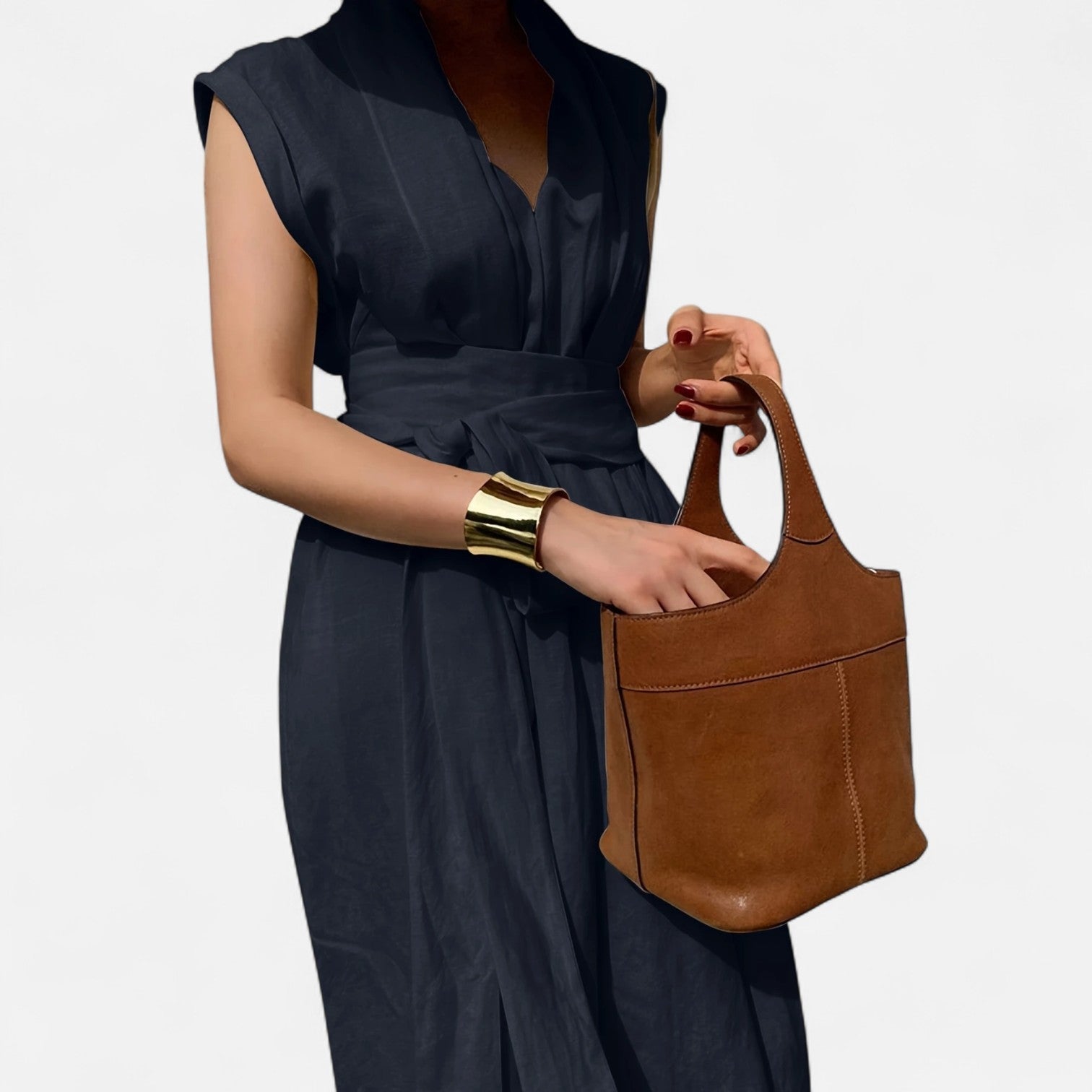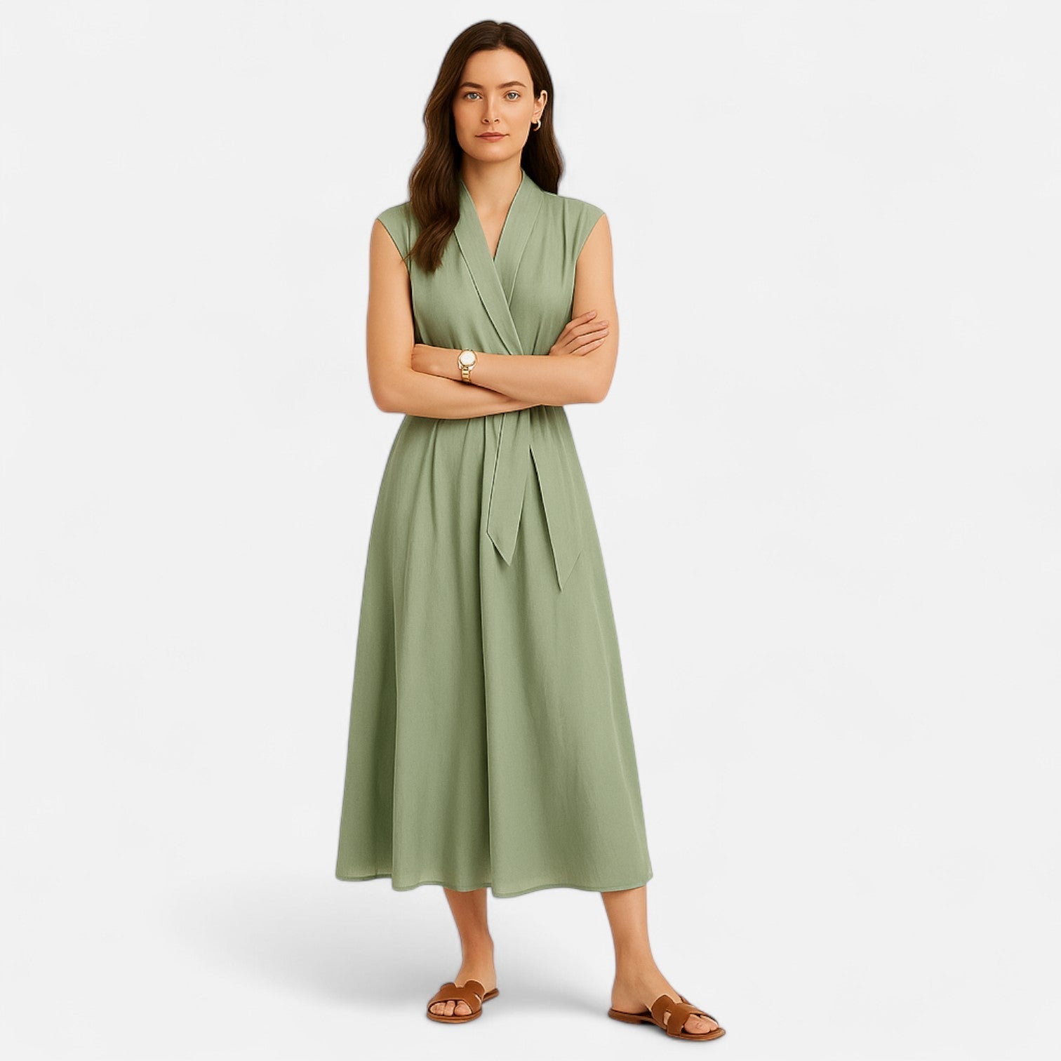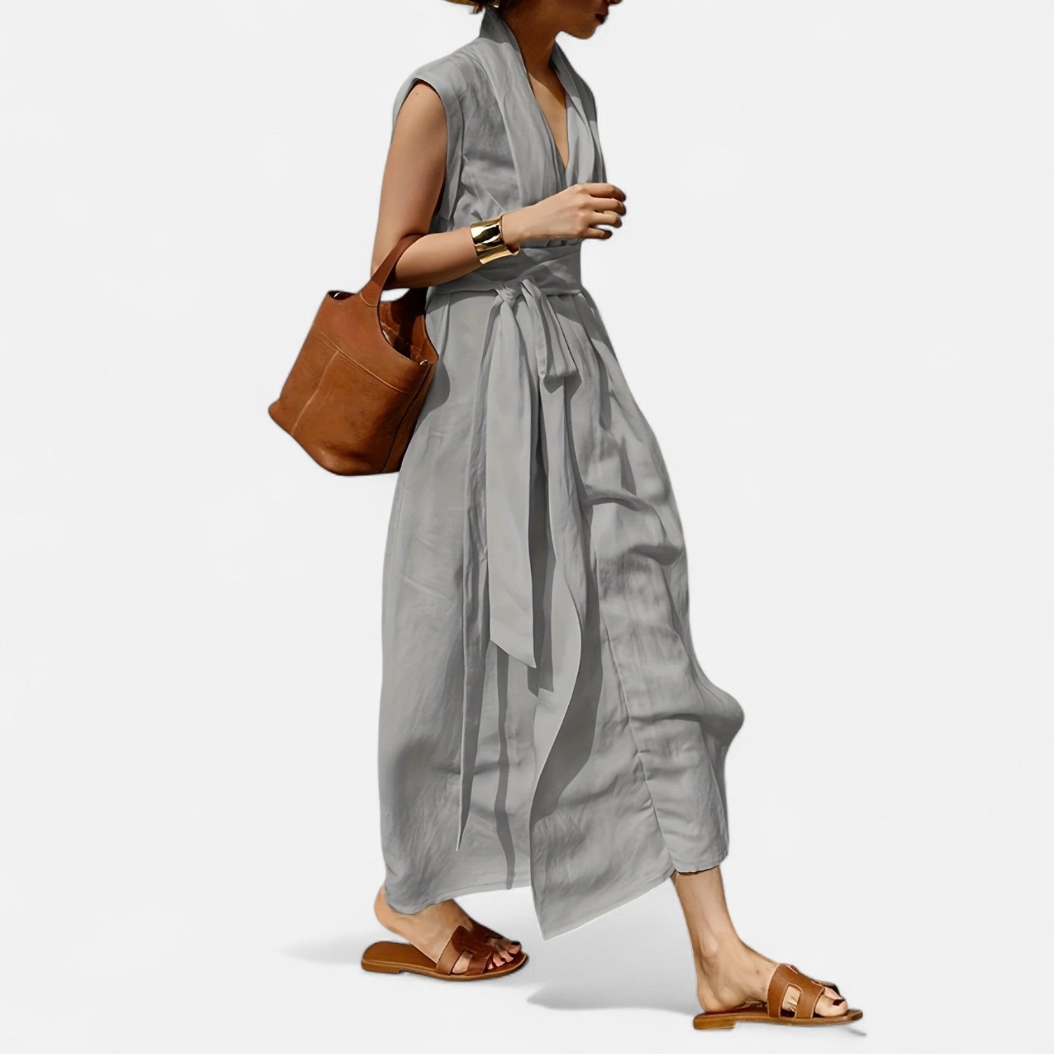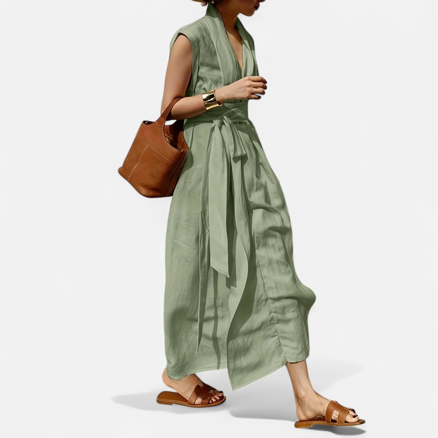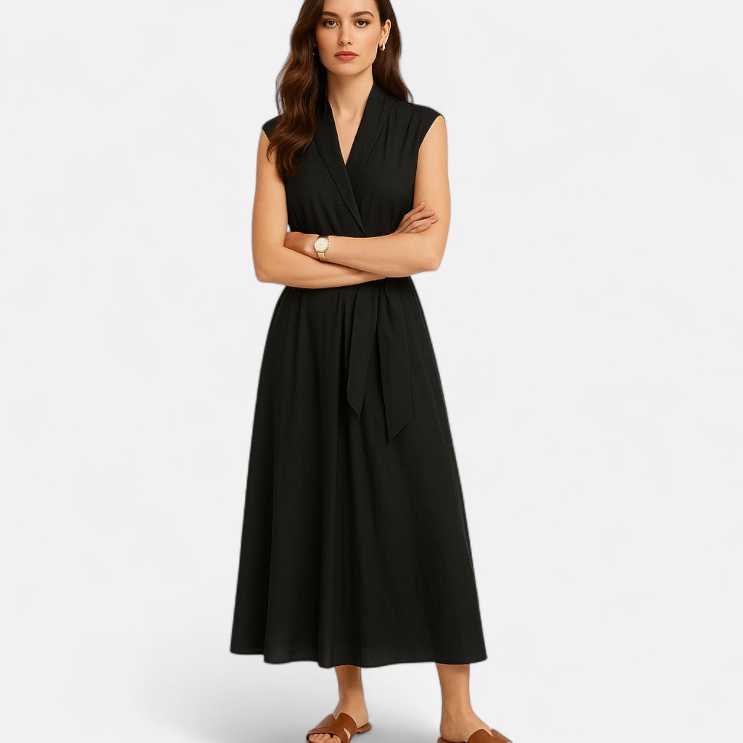 Crafted from a breathable linen blend, this dress keeps you cool while maintaining its refined drape. The sleeveless cut encourages freedom of movement, while the detachable belt allows you to define your waist for a polished silhouette. Hidden side pockets add discreet practicality, ensuring comfort meets elegance in every detail.
