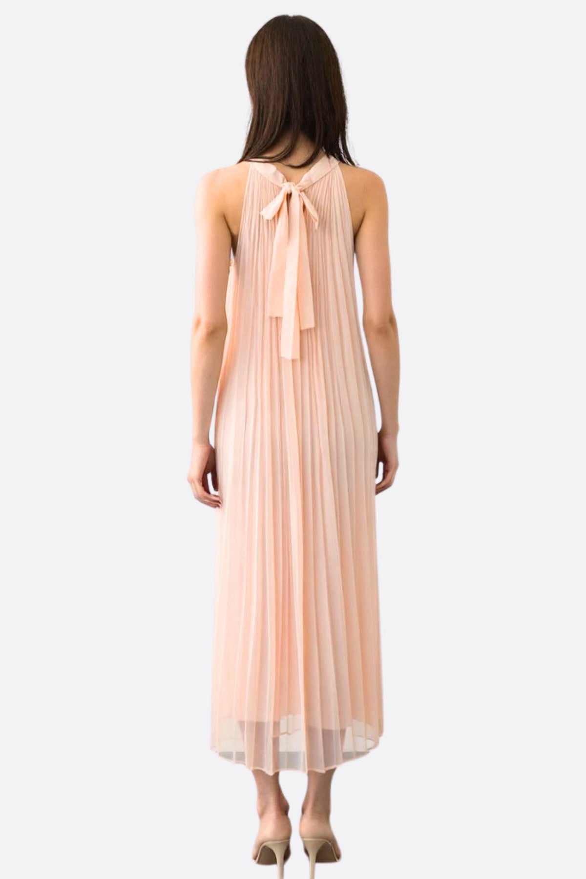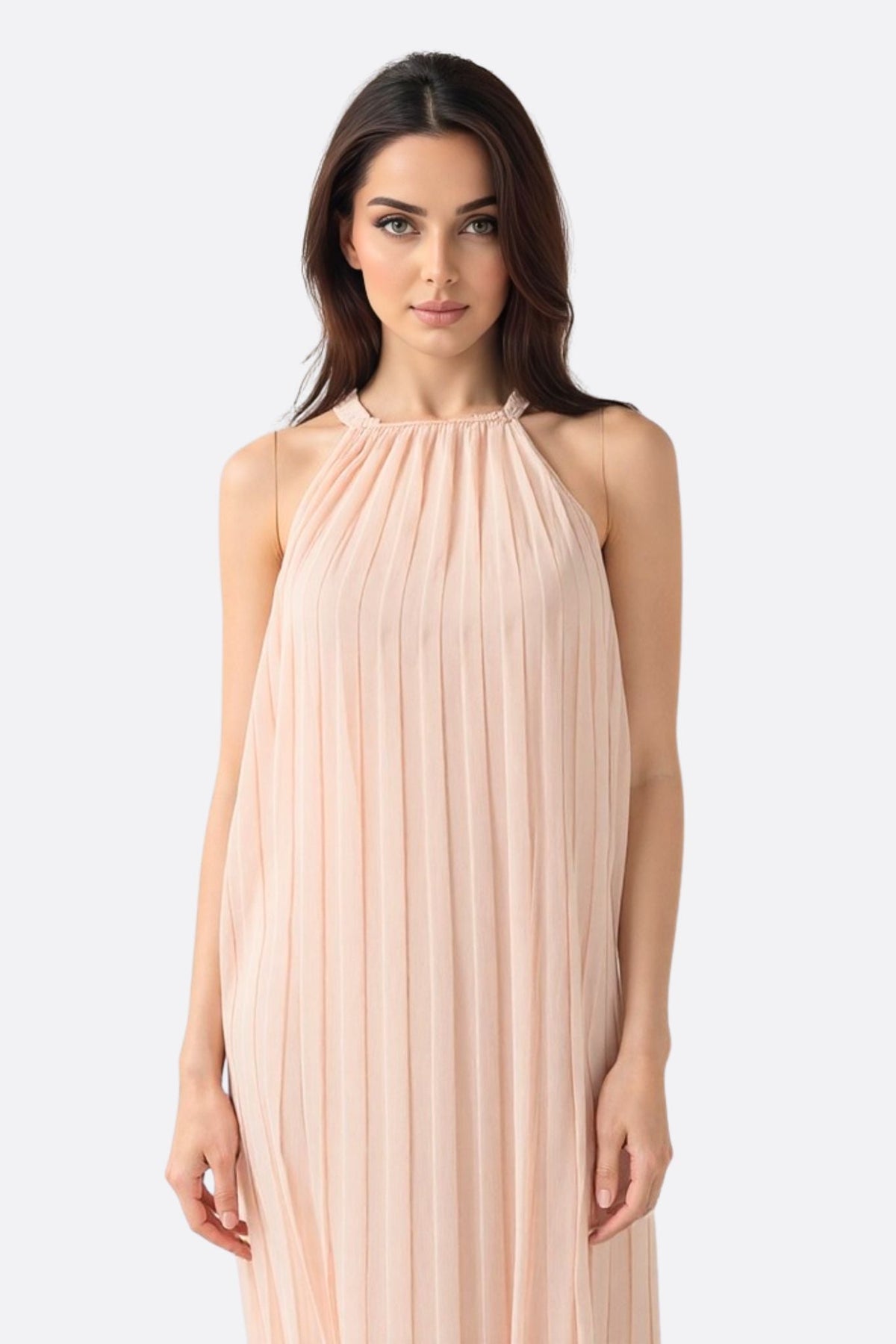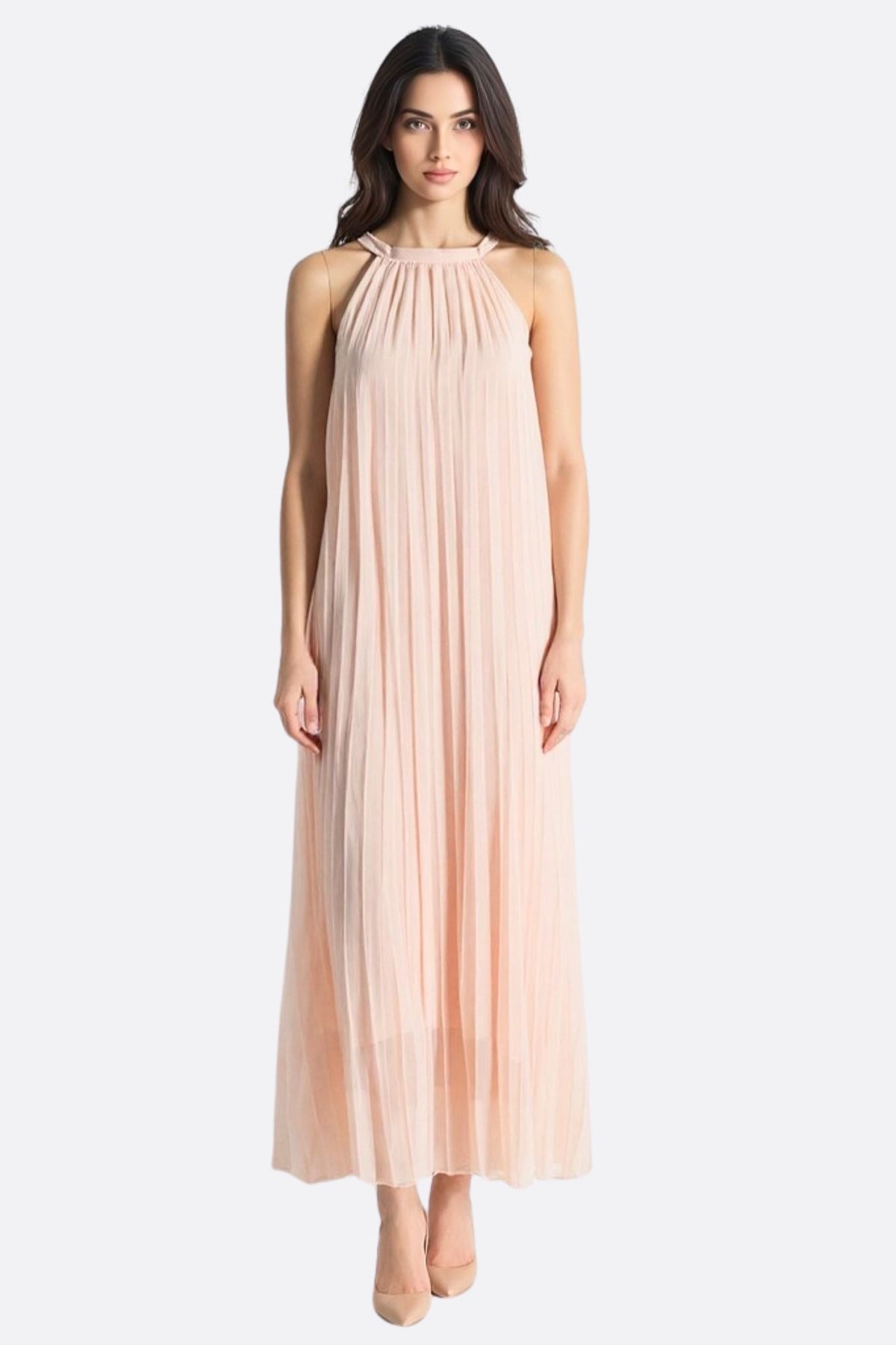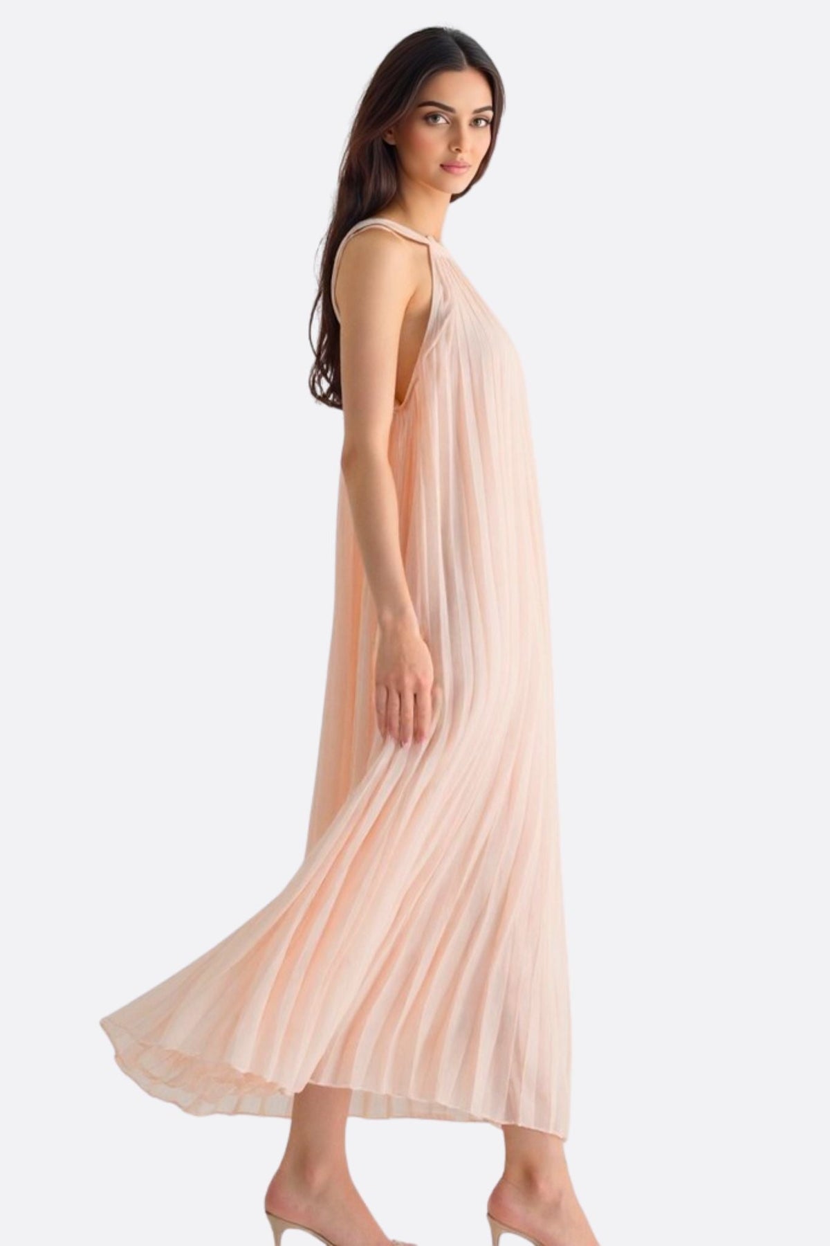 Elegant and timeless, this pleated chiffon maxi dress in blush pink is designed to move gracefully with every step. Crafted from high-quality chiffon, the flowing fabric and delicate pleats create a light, airy silhouette that flatters all body types.